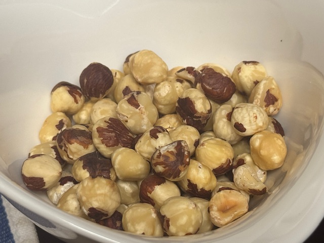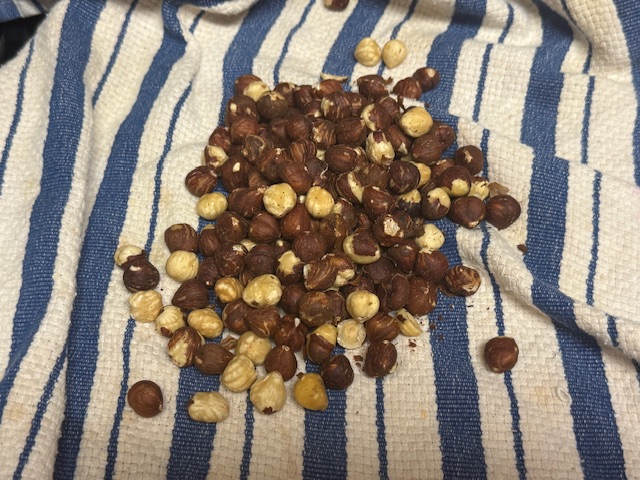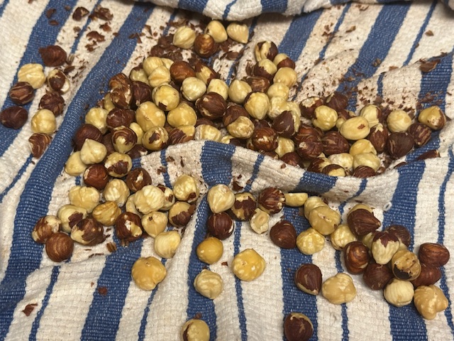 - Mettre les noisettes dans un torchon et les rouler pour retirer la peau. Je trouve que ça a ses limites, et après quatre fois, j’ai décidé que c’était assez.